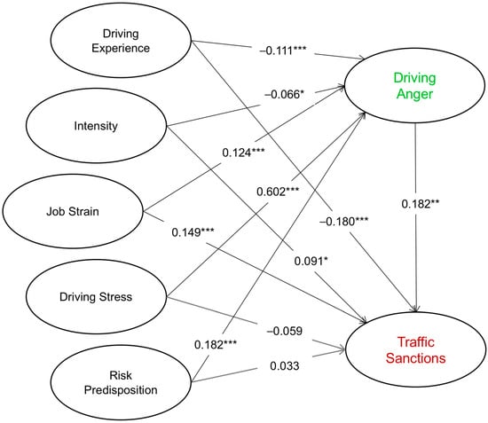 As for the hypothesized mediating role of driving anger, tested in this procedure, results showed that this variable mediates the link between driving experience (β = −0.111 ***), intensity (β = −0.066 *), job strain (β = 0.124 ***), driving stress (β = 0.602 ***), risk predisposition (β = 0.182 ***), and traffic sanctions (explained variable). That is, for the case of the first three, it implies the existence of a partial mediation, and a full mediation for the last two, as shown in Table 2. In other words, driving stress and risk predisposition of drivers need driving anger to acquire a statistically significant relationship with traffic sanctions reported in a period of two years.