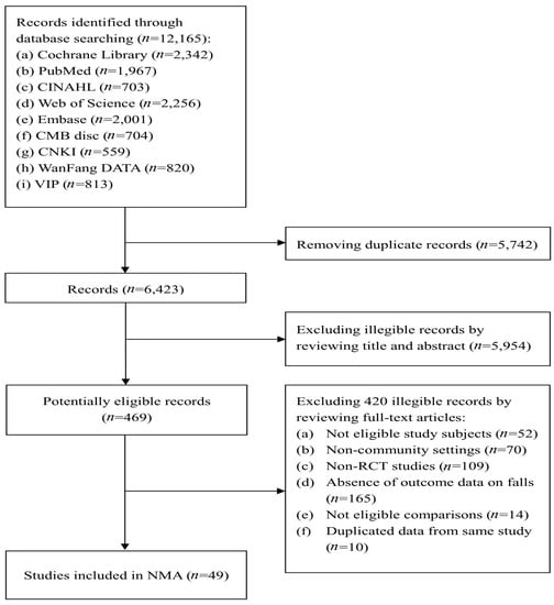 Our search strategy led to retrieval of, a total of 12,165 articles, of which 469 articles remained after removing duplicates and screening the titles and abstracts. After full-text assessment, 420 were excluded and 49 RCTs [,,,,,,,,,,,,,,,,,,,,,,,,,,,,,,,,,,,,,,,,,,,,,,,,] involving 27,740 enrolled participants and 9271 fallers were included in the NMA (Figure 1). Study characteristics are summarized in Supplementary Table S2. The studies reported a mean follow-up period of 13.6 months (range: 4 to 60 months). The sample size in the individual trials ranged from 34 to 3182 participants, with a mean sample size of 578. Most studies (46 of 49) reported the mean ages of participants, which ranged from 67.5 to 88.0 (mean age: 73.0 years old) around 65% of participants were women.
