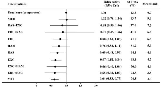 Pooled odds ratio, SUCRA and mean rank for each regimen, compared with usual care. Note: Labels of interventions: 1. Usual care (No specific fall intervention); 2. EDU (Education); 3. RAS (Risk assessment and suggestions); 4. EXC (Exercise); 5. MED (Medical care) 6. HAM (Hazard assessment and modification); 7. EDU + RAS (Education + risk assessment and suggestions); 8. EDU + EXC (Education + exercise); 9. RAS + EXC (Risk assessment and suggestions + exercise); 10. EXC + HAM (Exercise + hazard assessment and modification); 11. MFI (Multifactorial interventions). SUCRA (surface under the cumulative ranking curve probabilities) is a percentage of the efficacy or safety of every intervention relative to an imaginary intervention that is always the best without uncertainty. SUCRA = 1 means best intervention, worst SUCRA = 0).
