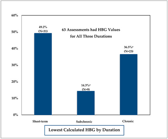 Comparison of health-based guidance (HBG) across durations. a Includes values that are equal to the lowest value (e.g., calculated subchronic HBG same as short-term HBG or calculated chronic HBG same as short-term or subchronic HBG).