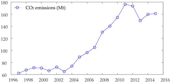 | Year | CO2 Emission Intensity | Total CO2 Emissions (Mt) | The CO2 Emissions from Coal and Coke (Mt) |