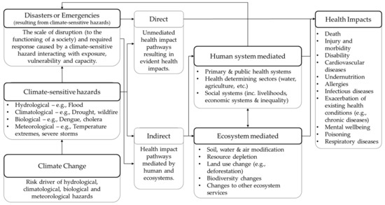 Direct and indirect health impact pathways of climate change and climate-sensitive disasters. Developed based on frameworks contained in [13,16,24,27,67].