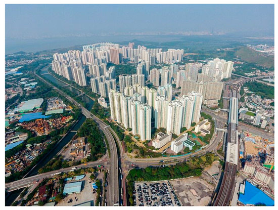 The aerial view of Tin Shui Wai in 2016 [26]. It is a typical Hong Kong new town, confined by open rural areas and connected to other districts with mass transit railway (MTR) and other public transportation services.