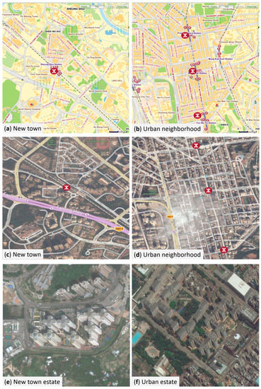The Hong Kong new towns are often confined by surrounding open areas (a & c). The established urban areas are continuously developed, and different parts are immediately adjacent to each other (b & d). The new town housing estates far from MTR stations are adjacent to open rural areas (e), while urban housing estates far from MTR stations are still surrounded by dense urban developments (f). Legend: red dots represented MTR stations. (Source: Microsoft Bing maps.).