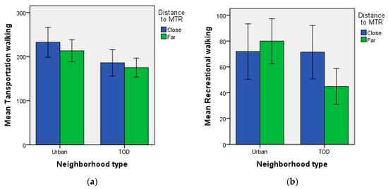 The mean transportation walking (a) and recreational walking time (b) (in minutes/7 days) by neighborhood types (urban vs. TOD) and distance to MTR stations (close vs. far). The error bars represent standard errors. Public housing residents within 400 m walking distance to a MTR station were classified in the close group; those within 800–1200 m were classified in the far group.
