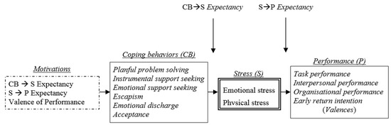 Coping behaviours denote the efforts made by an individual to manage stress [21]. The concept is actually congruent with the idea of effort as defined in Vroom’s expectancy theory, which concerns actions taken in response to a broader situation, including stressful situations. Hence, based on this theory, the relationships between individual motivation-to-cope, coping behaviours, stress, and performance can be conceptualised as below (refer to Figure 1). ECPs will be motivated to cope with their stress by undertaking certain coping behaviours (i.e., problem-focused coping behaviors (e.g., planful problem solving, positive reappraisal, and instrumental support seeking) and/or emotion-focused coping behaviors (e.g., escapism, self-control, and emotional support seeking); [21] if they have high expectancy in relation to the effect of that behaviour on their stress (that is, CB → S expectancy), high expectancy in relation to the impact of stress on their performance (S → P expectancy), and high anticipated satisfaction with their performance (valence).
