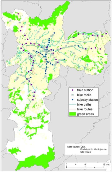 - Municipality of Sao Paulo. Geosampa. Bike Paths in Sao Paulo City. Available online: http://geosampa.prefeitura.sp.gov.br/PaginasPublicas/_SBC.aspx (accessed on 1 July 2016). (In Portuguese)
