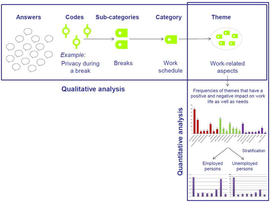 After having finalized the qualitative analysis, absolute and relative frequencies of the extracted themes were calculated for the total sample and stratified by occupational status (employed and unemployed) (see Figure 1).