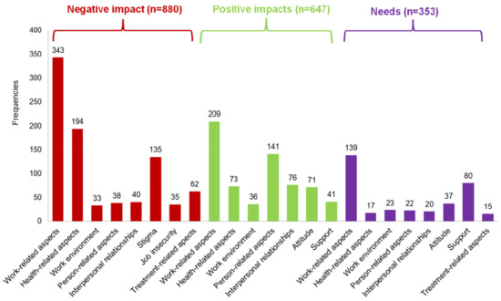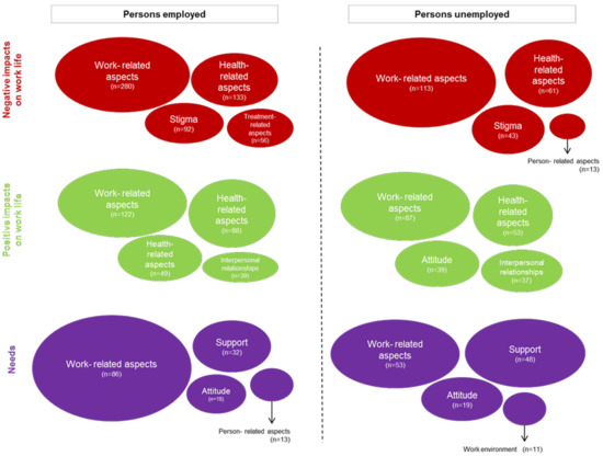 In total, 428 persons (87.9%) reported on Factors having a negative impact and 407 persons (83.6%) on Factors having a positive impact on work life. Only 191 (39.2%) reported on Needs that would be helpful to maintain a job or return to work. From all answers we identified 1880 codes (n = 880 Factors having a negative impact; n = 647 Factors having a positive impact; n = 353 Needs) (see Figure 3). We built 101 categories based on the 1880 codes, and from these ten themes were formed (see Table 3).