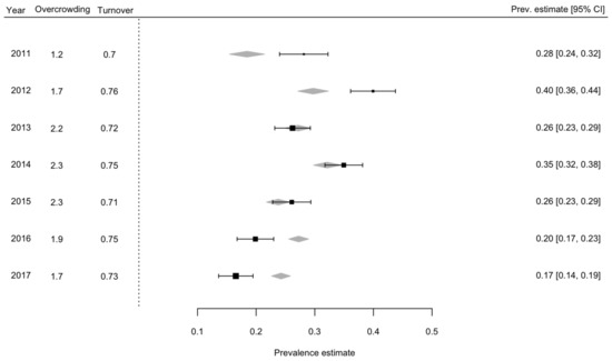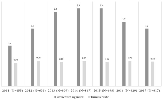 The prevalence estimate of self-harm events was 26.4% (95% confidence interval (CI): 25.1–26.2). Descriptive statistics of overcrowding and turnover are reported in Figure 1. Overcrowding had an increasing trend until 2014, after which it started to decrease. On average, the overcrowding index was 1.77 over the seven-year period, which corresponded to an occupation rate of 177% above the official prison capacity. On average, the turnover was 73% and remained relatively stable during the seven-year period, which meant that 73% of the prison population was entirely renewed each year.