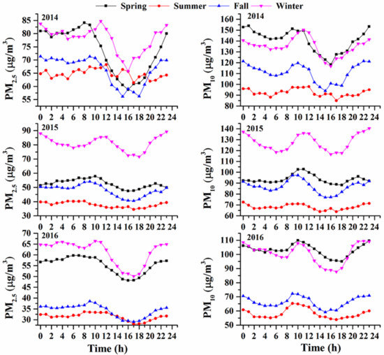 Diurnal variation of hourly PM2.5 and PM10 concentrations in 2014, 2015 and 2016.