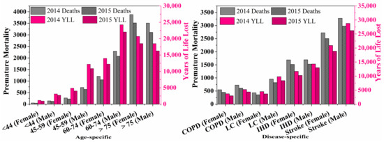 Long-term exposure to PM2.5 contributed to 98,802 and 87,647 years of life lost in 2014 and 2015, respectively. Relative contributions of COPD, LC, IHD and stroke to YLL are shown in Figure 4. In general, additional YLL attributable to PM2.5 decreased from 2014 to 2015, and the lost years were also higher in males than in females, mainly because of a higher all-cause mortality rate in males. Similar to the premature death, the contribution of stroke to YLL was the highest, followed by IHD, suggesting that cardiovascular disease (stroke and IHD) instead of respiratory diseases (COPD and LC) accounted for the majority of deaths and YLL attributable to ambient PM2.5 air pollution. YLL per 1000 person for COPD, LC, IHD and stroke were 1.08, 1.73, 3.16 and 6.05 years in 2014, and 0.89, 1.46, 2.82 and 5.48 years in 2015, respectively. As expected, YLL per 1000 person was higher in males than in females, and the contributions of cardiovascular disease were higher than that of respiratory diseases. Figure 4 shows the contributions of deaths in different ages to YLL. Differently to the premature mortality, 60–74 gerontism contributed more to YLL than the gerontism (>75) did. YLL in Nanjing (estimated in this study) was about 1065 years per 100,000, higher than the numbers of developed countries, such as USA (337.1 years per 100,000), Brazil (573.7 years per 100,000), Japan (261.7 years per 100,000) in 2015 estimated by Cohen et al. [28]. These results implied that health burden associated with PM2.5 in Nanjing was serious, and more rigorous regulations should be taken in Nanjing.