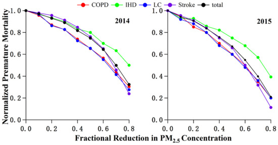 Figure 5 estimates the avoidable premature mortality when PM2.5 concentrations are reduced to different levels. A 50% reduction in PM2.5 concentrations in 2014 would lead to 35%, 20%, 35% and 24% reductions in premature mortality for COPD, IHD, LC and stroke, respectively. The corresponding reductions in premature mortality were 40%, 25%, 40% and 34% from the 2015 level. To achieve a 50% reduction in COPD, IHD, LC and stroke-caused excess mortality, PM2.5 concentrations need to be reduced by 64%, 80%, 64% and 68% relative to the 2014 level, and 60%, 74%, 58% and 60% relative to the 2015 level, respectively. The benefits of reducing PM2.5 for COPD and LC were higher than those for stroke and IHD. Besides this, the excess mortality as a whole decreased slowly in the beginning, but the marginal benefit grew faster with a progressive reduction in PM2.5 concentrations. We can conclude that higher benefits could be obtained by a proportionate reduction in PM2.5 when initial PM2.5 concentration was lower, and these results were consistent with earlier research by Hu et al. and Joshua et al. [22,23].