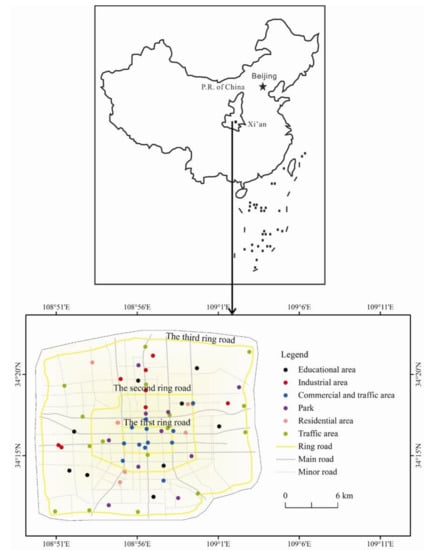 - Chen, X.D.; Lu, X.W.; Li, L.Y.; Yang, G. Spatial distribution and contamination assessment of heavy metals in urban topsoil from inside the Xi’an second ring road, NW China. Environ. Earth Sci. 2013, 68, 1979–1988. [Google Scholar] [CrossRef]