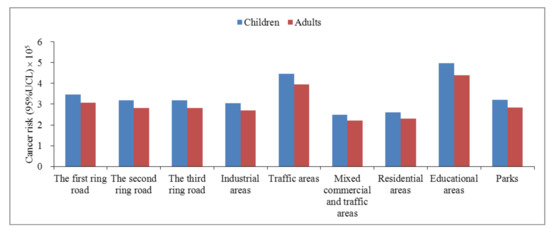 As shown in Figure 2, the total cancer risk of children and adults exposure to PAHs from urban soil is relatively high in educational and traffic areas, followed by the first to third ring roads, industrial areas and parks, and relatively low in mixed commercial and traffic areas as well as residential areas. In addition, they decrease from the first to third ring roads. Therefore, more attention should be paid to educational and traffic areas.