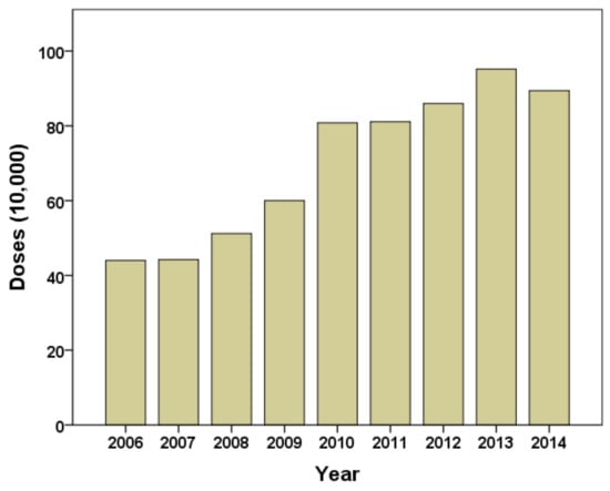 Annual distribution of JE vaccination doses at the provincial level (2006–2014).