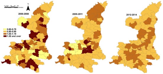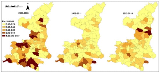 Table 2 indicates the spatial distribution of JE incidence and socio-environmental variables selected at the county level in this study. Meteorological variables and JE incidence covered the months between June and October 2006–2014. Most variables had an approximately normal distribution. Figure 2 shows the JE incidence (annual average) at the county level in three study periods. In general, 2006–2008 had a higher incidence than 2009–2014. The south, west of the middle and part of the north had the highest incidence between 2006 and 2008. Areas with high incidence were also discovered in the south between 2009 and 2011, and in the north between 2012 and 2014. The spatial pattern of JE incidence in each year was mapped in Supplementary File Figure S1. The years 2006, 2007, 2009 and 2013 had a significant spatial variation of JE incidence.