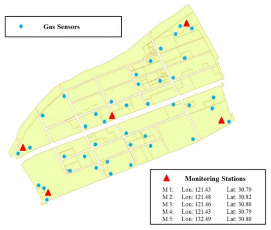 Layout of the case study (the triangles indicate the high-accuracy air quality monitoring stations, while the circles represent gas sensor modules in this figure).