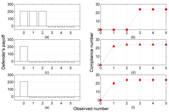 Defender’s payoff and compliance number under different observation number ((a) is the defender’s payoff under piecewise function; (b) is the compliance number under piecewise function; (c) is the defender’s payoff under exponential fall function; (d) is the compliance number under exponential fall function; (e) is the defender’s payoff under power law function; (f) is the compliance number under power law function).