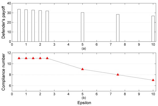 Significantly, it is worthwhile to note that when the value of epsilon is set between 0 and 2.5, the compliance number from the attackers is unchanged; and the phenomenon indicates that the rational level of attackers in this case can be categorized into the same class. Besides, a critical value of epsilon may exist in the interval between 2.5 and 5, leading to the variation in compliance number from the attackers. Moreover, as the value of epsilon increases further, the compliance number from the attackers will reduce correspondingly. The phenomenon is consistent with a common sense where attackers with a high level of bounded rationality are more likely to deviate from their optimal choice, rather than comply with the inspection agency. To better illustrate this, the above findings are clearly drawn in Figure 4. The defender’s payoff and compliance number from the attackers are decreasing with the increase of epsilon .