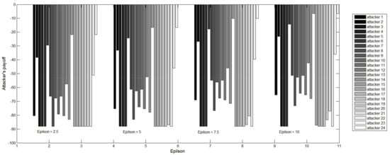In addition, the corresponding payoffs of attackers under different rational levels are listed in Table S6 and are drawn in Figure 5. In Figure 5, the figure legend represents different colors with respect to corresponding attacker’s payoff in a combined column. It is concluded that the attacker’s payoff also reduces with the increase of epsilon , because the attackers are more likely to discharge excessive air pollutants when the inspection resources are in the working states. Therefore, chemical plants are more likely to be fined for their irregularities.