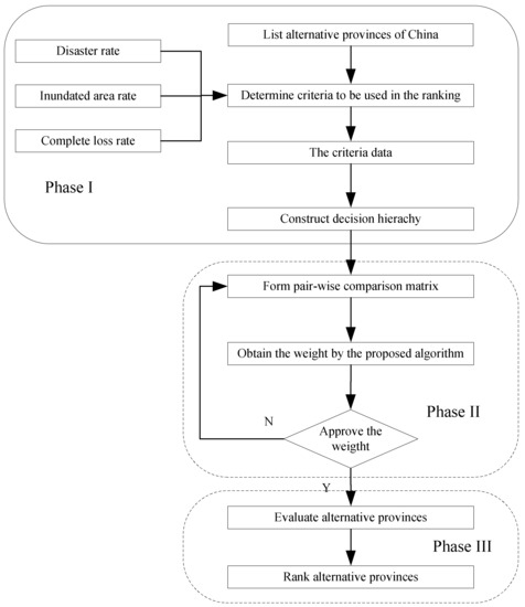 There are 31 provinces and cities and the number of criteria is three. Therefore, the decision matrix fij (i = 1, 2, …, 3; j = 1, 2, …, 31) can be obtained. Following this, the disaster evaluation is determined by using the TOPSIS in the third phase, according to Equations (14)–(20). The province rankings are determined, according to the CC that is calculated using TOPSIS, in descending order. Figure 1 presents the whole process.