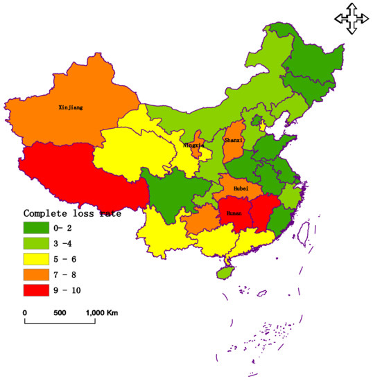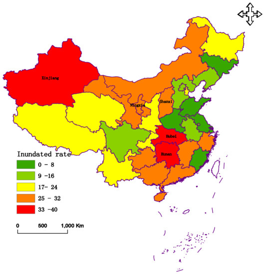 Figure 3, Figure 4 and Figure 5 indicate that Hunan Province had the greatest disaster rate and inundated rate, at 59.21% and 37.6%, respectively. The autonomous region of Tibet had the largest complete loss rate. Shanghai experienced the lightest disaster, with rates of 5.4%, 2.1%, and 0%, respectively.