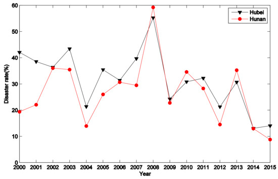 The disaster rate of Hunan Province and Hubei Province from 2000 to 2015.