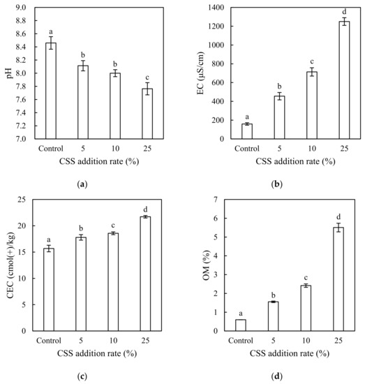 (a) pH of the control and amended soil; (b) electrical conductivity (EC) of the control and amended soil; (c) cation exchange capacity (CEC) of the control and amended soil; (d) organic matter (OM) of the control and amended soil. For a given property, the columns labelled with the same letter were not significantly different at a significance level of p < 0.05 by the least significant difference (LSD) test. The error bars represent one standard deviation (n = 3). CSS: composted sewage sludge.