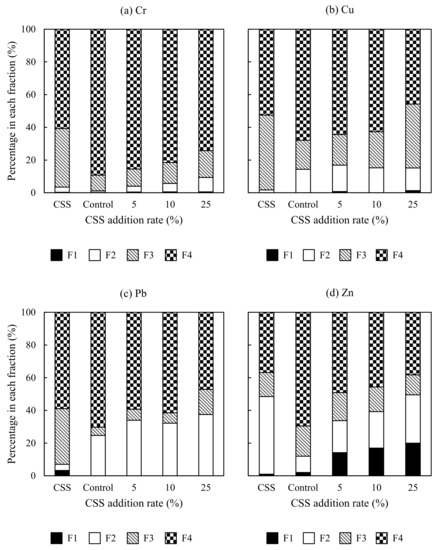 In the case of Zn, unlike the distribution of Cr, Cu, and Pb, Zn predominated in F2 in the CSS, with 36.8% in F4 and 14.8% in F3. Tongesayi et al. [20] also found Zn to be highly associated with the reducible fraction of biosolids. Zn was primarily extracted in F4 in the control. Both the percentages of Zn in F3 and F4 were decreased with CSS addition rate, while both the percentages of Zn in F1 and F2 were increased with CSS addition rate. The percentage of Zn in F4 was decreased to 38.3% in the soil amended with 25% CSS. Compared with Cr, Cu, and Pb, a notably large amount of exchangeable Zn was extracted in the amended soil. The percentage of Zn in F1 was increased from 2.1% in the control to 20.0% in the soil amended with 25% CSS. This can be attributed to the transformation of reducible Zn sourced from the CSS to exchangeable Zn at lower pH [38]. Qiao et al. [17] also demonstrated the sensitivity of Zn to soil acidity.