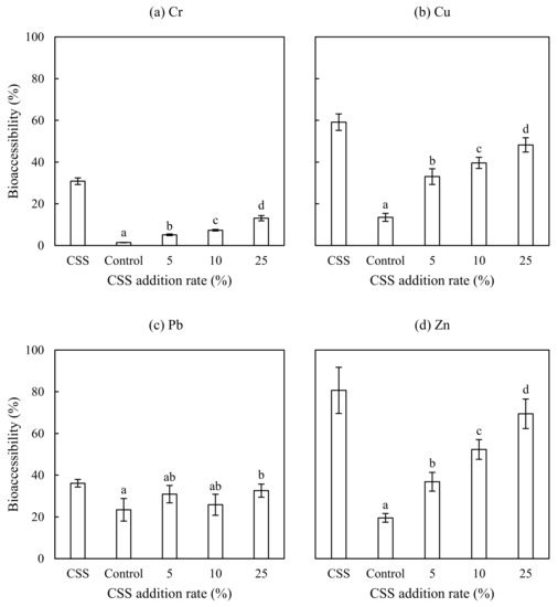 Heavy metal bioaccessibility in the CSS, control, and amended soil. For a given element, the columns labelled with the same letter were not significantly different at a significance level of p < 0.05 by the LSD test. The error bars represent one standard deviation (n = 3). (a) Cr bioaccessibility in the CSS, control, and amended soil; (b) Cu bioaccessibility in the CSS, control, and amended soil; (c) Pb bioaccessibility in the CSS, control, and amended soil; (d) Zn bioaccessibility in the CSS, control, and amended soil.