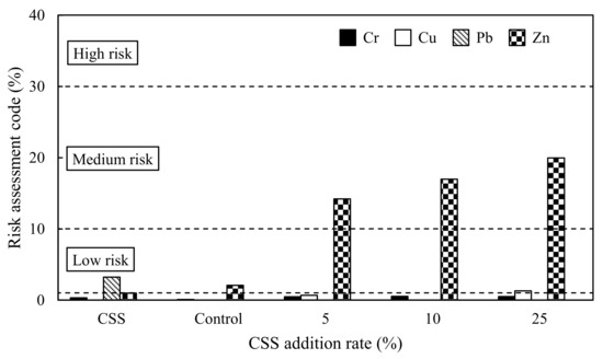 The RAC for Cr, Cu, Pb, and Zn in the CSS, control, and amended soil is shown in Figure 4. The CSS showed no risk for Cr, Cu, and Zn, and a low risk for Pb. The control showed no risk for Cr, Cu, and Pb, and a low risk for Zn. The addition of CSS only resulted in a conspicuous increase in the RAC values of Zn, with a medium risk for Zn in all amended soils. The RAC value of Zn was increased with CSS addition rate. Overall, the medium risk of Zn indicated a substantial risk of Zn mobilisation in the amended soil.