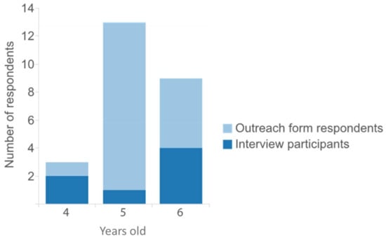 Figure 1 shows how response was distributed depending on the age of the child, with dark blue representing those who participated in an interview (in addition to returning the outreach form), and light blue representing those who returned the outreach form only. Parents and guardians of five-year-olds returned the greatest number of outreach forms (n = 13, 52%) compared with parents and guardians of six-year-olds (n = 9, 36%) and parents and guardians of four-year-olds (n = 3, 12%), but few of these respondents were both interested in and available for an interview.