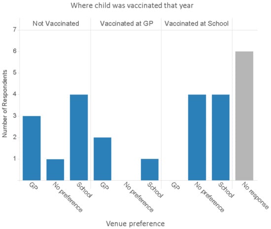 A key question this research sought to answer was whether parents prefer to have their child vaccinated at school or at the GP, and their reasons for this preference. Figure 2 gives an overview of venue preferences reported on the outreach form, broken down by whether their child was vaccinated at the GP, at school, or was not vaccinated at all. It is noteworthy that amongst respondents whose child was vaccinated in school, none expressed a preference for vaccinating at the GP in future. Parents whose child was vaccinated at the GP expressed interest in both venues (two expressed interest in vaccinating at the GP, and one in the school), as did parents whose child was not vaccinated against flu at all that year (three expressed interest in vaccinating at the GP, and four in the school).
