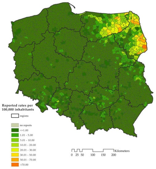 - Stefanoff, P.; Orliková, H.; Príkazský, V.; Bene, C.; Rosińska, M. Cross-border surveillance differences: Tick-borne encephalitis and lyme borreliosis in the Czech Republic and Poland, 1999-2008. Cent. Eur. J. Public Health 2014, 22, 54–59. [Google Scholar] [PubMed]