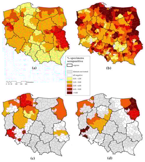 - Stefanoff, P.; Siennicka, J.; Kaba, J.; Nowicki, M.; Ferenczi, E.; Gut, W. Identification of new endemic tick-borne encephalitis foci in Poland—A pilot seroprevalence study in selected regions. Int. J. Med. Microbiol. 2008, 298, 102–107. [Google Scholar] [CrossRef]