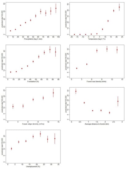 - Forest edge density (length of forest edge divided by municipality area), categorized: 0–3 m/ha, 3–6, 6–9, 9–12, 12 and more (the most numerous category 6–9 km selected as reference level);