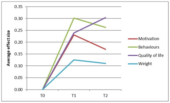 Figure 1 offers a visual summary of all the changes among the adult participants regarding motivation, behaviours, quality of life and weight. A positive change in effect size corresponds to a change in a healthier direction. All four components were increased at T1, followed by a slight decrease (quality of motivation, behaviour and weight) or further increase (quality of life) at T2. All aggregated effect sizes can be categorized as small (0–0.32).