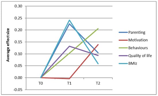 Figure 2 shows all the healthy changes among the parents and children regarding parenting, motivation, behaviours, quality of life and BMIz. All aggregated effect sizes clustered around 0.10 at T2 (small effect sizes), except for the behaviours (with an average effect size of 0.20).