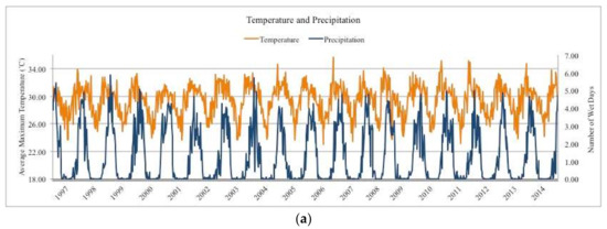 Precipitation, or ‘wet days’, was defined as the number of days it rained one millimeter (mm) or more in a week. This classification is one of 27 indices developed by the World Meteorological Organization Commission for Climatology and the Expert Team on Climate Change Detection and Indices (ETCCDI) [20].