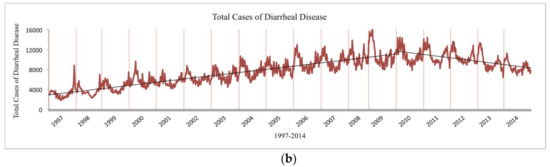 There were 7,315,738 reported cases of diarrheal disease over 18 years from 141 administrative districts (n = 126,056). Total and weekly average cases varied by region (Table 1). The number of cases reported weekly increased from 1997–2009, and case counts peaked nationally and within all four regions in 2009. There was a decreasing trend in the number of cases reported weekly from 2009–2014. There was an average of 85 cases reported by each district every week (Figure 1 and Table S2).