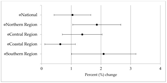 We estimated a 1.04% (95% CI: 0.42, 1.66) increase in diarrheal disease counts for each additional wet day considered over a consecutive four-week period, controlling for time, average high temperature, and region (Figure 2). Regionally, one additional wet day (over 4 week lag) was associated with an increase in disease of 1.86% (95% CI: 1.05, 2.67), 1.37% (95% CI: 0.70, 2.04), 0.63% (95% CI: 0.11, 1.14), and 2.09% (95% CI: 1.01, 3.18) in the northern, central, coastal, and southern region, respectively (Figure 2). The southern and northern regions had the strongest association with precipitation.