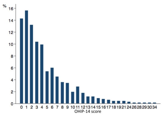 Histogram of the Oral Health Impact Profile 14 (OHIP-14) score in the overall study sample (n = 666).