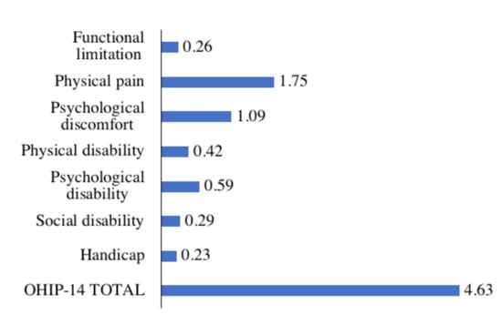 Studies have shown that young and middle-aged adults report worse OH than older adults, despite the fact that oral problems tend to increase with age [,,]. The factors that affect self-reported OH are not well understood, but it has been suggested that oral diseases have a deleterious effect on subjective OH, and that this effect is likely higher at younger ages []. Moreover, the attitude toward OH acquired in young life manifests as life goes on and may affect OHRQoL. Several studies on OHRQoL in young adult populations, including young university students, have been conducted in Japan [], Sweden [], Tanzania [], Malaysia [], Australia [], China [], and Korea []. Previously reported factors associated with OHRQoL include negative life events []; education [,]; self-rated OH [,]; and subjective symptoms of temporomandibular disorders and oral pain []. The influence of clinical factors (dental caries, missing teeth, and periodontal status) on OHRQoL is inconsistent, with some studies showing no relationship [,] and others showing that poor clinically-assessed OH is associated with worse OHRQoL [,,]. It was also found that malocclusion has a negative impact on OHRQoL in young adults [,]. Few studies on OHRQoL targeted dental students [,,]. Medical and dental students are expected to be more conscious of health-related issues, including dental health. Moreover, these students tend to have a higher socioeconomic background, which in turn, may lead to better self-reported OH and clinically-assessed OH and, eventually, to a higher OHRQoL. Nevertheless, in a Brazilian study nearly half of participating dental students reported negative impacts on their OHRQoL []. Self-reported OH problems and aspects related to previous dental experience were found to have a greater impact on OHRQoL [,], although no clinical factors were studied. Almost all of the aforementioned studies used OHIP-14 to measure OHRQoL in young adult populations.