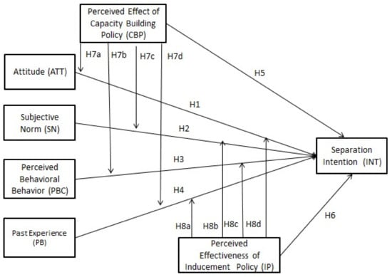 Capacity building policies include the provision of facilities, public propaganda, and education, which are vital determinants in RRSW separation. It has been proven that capacity building is very important in promoting RRSW separation (Chen, 2010) and that a perceived low level of capacity building (e.g., perceived lack of facilities) may decrease the intention [4]. Thus, the PPE can be regarded as a moderator because PPE can influence the strength between the independent and dependent variables [30]. On one hand, improving the facilities’ condition and providing necessary propaganda and education can enhance the residents’ positive attitude to participate in separation [31]. On the other hand, if individuals find insufficient facilities and technology provision, they will not form the intention and take an actual action even with a high level of attitude [4]. At the same time, PBC is the perceived analysis an individual feels concerning the ease or difficulty of a specific behavior. Hence, the more capacity building measures are provided, the higher the perceived ease in conducting a behavior, thus leading to the positive moderating effects of PPE. Hence, the following hypotheses are proposed: