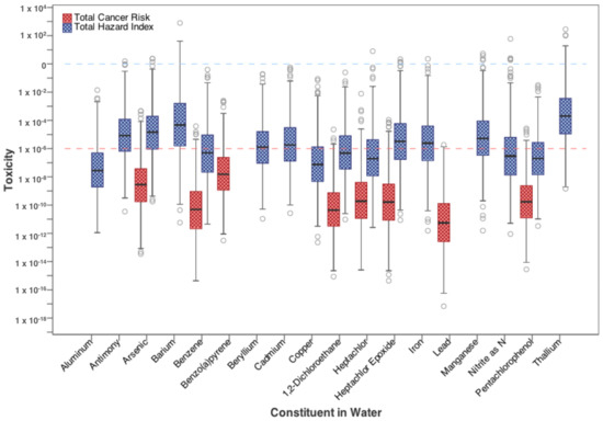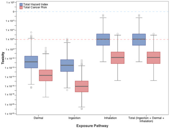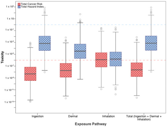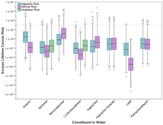- Dermal exposure to contaminated water: This pathway examines direct skin contact with contaminated water during showering or bathing. This scenario assumes total skin surface area exposure for 43 min every day based on average values recommended by the Exposure Factors Handbook [49].