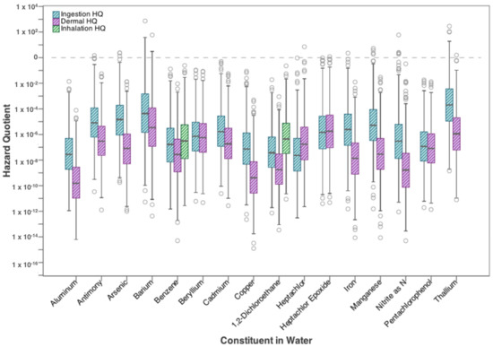 - Ingestion of contaminated drinking water: This scenario assumes direct ingestion of unfiltered residential drinking water. An average daily water ingestion rate of 2.5 L/day was used in this calculation [49].