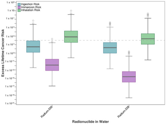 - Inhalation of VOCs that may volatilize from the water to the air: This exposure pathway applies to chemicals with a Henry’s Law constant greater than 1 × 10−5 atm⋅m3/mole and a molecular weight less than 200 g/mole, as they are most likely to volatilize from water during use and contaminate the air. Three carcinogens examined in this assessment meet these criteria, benzene, 1,2-dichloroethane, and vinyl chloride, as well as the radionuclides which may volatilize or aerosolize. This scenario assumes a default volatilization rate of 0.0005 × 1000 L/m3 based on an equation defining the relationship between a volatile chemical’s concentration in water and its average volatilized concentration in the air [50]. This includes all household uses of water (showering/bathing, dish washing, cooking, etc.), and assumes an average daily air inhalation rate of 15 m3/day [49].
