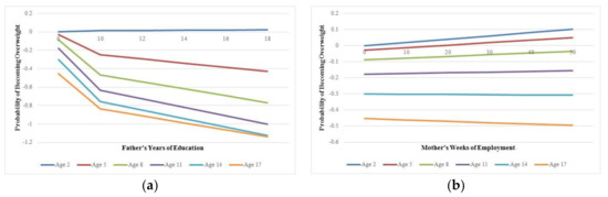 Visualization of the statistical interaction between parental socioeconomic status (SES) and child’s age in determining obesity risk: (a) Standardized probability of becoming overweight by father’s education and child’s age; (b) Standardized probability of becoming overweight by mother’s weeks of employment and child’s age.