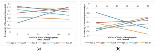 In order to tease out these complex racial effects, the interaction model findings were graphed. Figure 2 has a side-by-side comparison of the effects of mother’s weeks of employment by age for Whites (Panel A) and Blacks (Panel B) in predicting the probability of becoming overweight. The probabilities are not standardized, so it is impossible to determine the effect sizes using these figures. For White children, at very young ages (age 2), the more weeks the mother works, the higher the probability of becoming obese. However, for middle and late ages (ages 5+), mother’s employment lowers the probability of becoming obese. For Black children, at both very young (age 2) and very old (age 17) ages, the more weeks the mother works, the lower the probability of becoming obese. But, for Black children in between the ages of 2 and 17, mother’s employment elevates obesity risk.